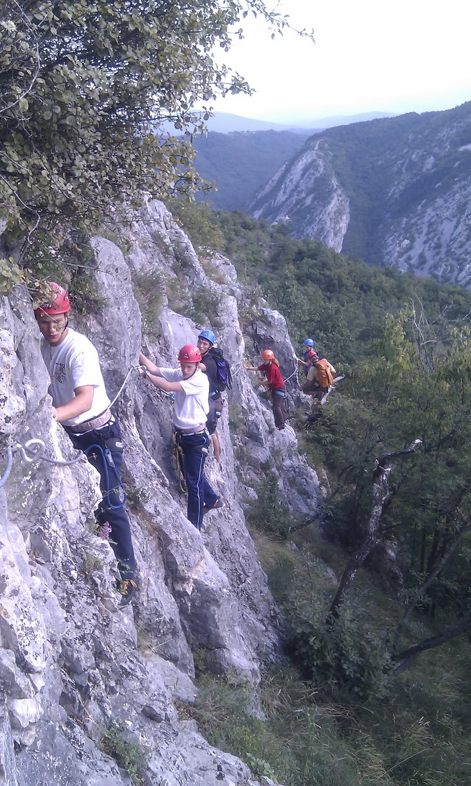 We met for climbing at the climbing store outside Pala residence where we got all the kit that we prepared on Tuesday (and for some people Wednesday). We got in the minibuses and drove for about half an hour or so to Val Rosandra, a mountainous area on the other side of Trieste to the sea, which gave a completely different view. This time, instead of doing normal climbing (as in vertical up and down sections along a rock face, with instructors at each one and you can try and do as many as you can), we did a mini via Ferata, in anticipation of next weekend’s trip to the famous course in the Dolomites. It was a completely different way of climbing, following a steel rope (which was brand new, as it happens, as Carlo, our Italian climbing instructor, had recently completed the refurbishment of the course with a local climbing group) and generally travelling horizontally, for about two hours. The way you do it is you have two ropes with clips (carabiners) which you clip onto the steel rope which is anchored into the wall every meter or so. And when you move one carabiner into the next section, it means you have one holding you in case you fall. You’re also allowed to use the rope in tricky spots, which proved to be quite useful. I happened to be a the front, which although you might think bad as people are behind you, turned out to be a blessing in disguise, as you never had to wait for people, and since I didn’t find it too hard, I had time to stop and look at the amazing view, the view of Slovenia and all the interesting flora and fauna around me. I have to say I really am looking forward to going to the proper via Ferata in the Dolomites now.